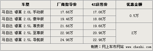 據(jù)一汽馬自達(dá)4S店銷售人員介紹,馬自達(dá)6睿翼目前全系車型最高可以優(yōu)惠現(xiàn)金2萬元,2.5排量三款車優(yōu)惠后最低僅售19.68萬,其中2.0排量車型目前也可以優(yōu)惠現(xiàn)金5千元。本月底經(jīng)銷店內(nèi)有黑色、銀色、紫色等現(xiàn)車供應(yīng)。