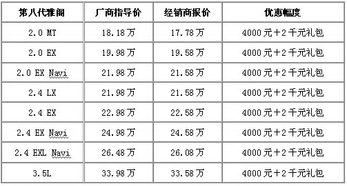 新雅閣,自誕生之日起就打著“史上最強(qiáng)雅閣”的旗號(hào),10月更是一舉奪得昆明中級(jí)車(chē)上牌量亞軍,其實(shí)力不容小覷。近日,車(chē)天下編輯從廣本梁源店獲悉,自2009年12月14日至12月31日購(gòu)置雅閣車(chē)型即可享受4000元?dú)q末現(xiàn)金優(yōu)惠以及2000元店慶購(gòu)車(chē)禮包。具體車(chē)型及詳細(xì)優(yōu)惠政策,如下表: