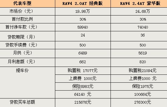 RAV4要比CRV更加野性一點,相比漢蘭達(dá)的“雄偉”,又帶一點收斂,這也正是它的獨特之處,喜歡這款車的朋友不妨也可以考慮一下貸款買車,分別有兩種方案,一種是首付三成貸款兩年,另外一種就是首付三成貸款三年。我們可以先看兩年還款方案,首付款也是三成,金額為但是兩年下來,總共買車的錢要比凈車款多出了1.6萬元,另外一種方案三年還清貸款后是要多付出2.9萬元。希望通過貸款的方式來購買這款車的朋友要根據(jù)自己的實際情況來確定方案。