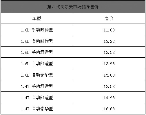 2009年10月19日,結(jié)束了歐亞大陸的長(zhǎng)途跨越,完成了對(duì)完美城市的探尋與交融,人們期待已久的第六代高爾夫終于在長(zhǎng)春正式宣布上市。第六代高爾夫共推出了1.6L和1.4TSI兩種排量、八款車型供消費(fèi)者選擇,兩種排量的發(fā)動(dòng)機(jī)都可匹配7速DSG雙離合自動(dòng)變速箱和5擋手動(dòng)變速箱,售價(jià)11.88萬-16.68萬元,具體售價(jià)如下表:第六代高爾夫市場(chǎng)指導(dǎo)售價(jià)