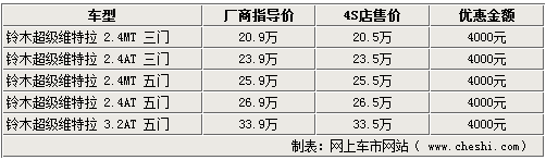 據(jù)記者走訪北京多家鈴木4s店了解到,目前店內(nèi)銷售的新超級維特拉全系優(yōu)惠4000元。低配的3門版2.4L 5速手動車型最低售價(jià)降為20.5萬元,而排量稍大采用5速自動變速器的5門版3.2L車型經(jīng)優(yōu)惠后售價(jià)也降為33.5萬元,是全系最高價(jià)。店內(nèi)現(xiàn)車顏色方面,新超級維特拉有黑、灰等顏色供消費(fèi)者選購,最低配的2.4L 3門手動版車型和3.2L 5門自動檔車型店內(nèi)現(xiàn)車不全,欲購買的消費(fèi)者需交2萬元訂金,約等半個月即可提車。
