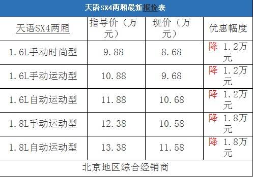 近日,編輯從北京地區(qū)長安鈴木綜合經(jīng)銷商處了解到,天語SX4兩廂有黑色和紅色現(xiàn)車,目前購車最高有1.8萬元的現(xiàn)金優(yōu)惠,并且贈(zèng)送汽車裝飾,性價(jià)比非常不錯(cuò)。據(jù)經(jīng)銷商透露,消費(fèi)者想要以這個(gè)價(jià)格提車,需要在店內(nèi)做一條龍服務(wù),其中車輛四項(xiàng)基本保險(xiǎn)可以打8.5折(約合3500-4100元左右)。以下是天語SX4最新價(jià)格變化表: