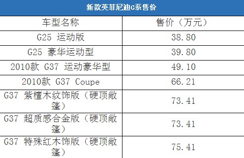1月11日,英菲尼迪G系全線上市。其中,英菲尼迪 G37硬頂敞篷跑車為人民幣75.41萬(wàn)元(特殊紅木飾版)和73.41萬(wàn)元(木飾版);G25 運(yùn)動(dòng)型豪華轎車售價(jià)為人民幣39.8萬(wàn)元(豪華運(yùn)動(dòng)版)和38.8萬(wàn)元(運(yùn)動(dòng)版)。同期上市的還有2010款英菲尼迪 G37雙門跑車和四門運(yùn)動(dòng)型豪華轎車,售價(jià)分別為人民幣66.21萬(wàn)元和49.1萬(wàn)元。