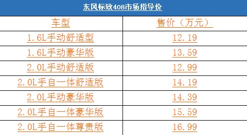 1月25日,東風(fēng)標(biāo)致408在北京全球首發(fā)上市,共推出1.6L和2.0L排量7款車型,售價12.19-16.99萬元。這是標(biāo)致汽車品牌創(chuàng)立120年以來,首次在海外市場全球首發(fā)其最新一代車型。這不僅顯示出中國市場日漸提升的重要地位,更凸顯標(biāo)致汽車乃至PSA標(biāo)致雪鐵龍集團的中國戰(zhàn)略重心的進一步確立。具體售價如下表: