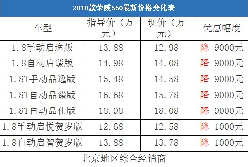 近日,編輯從北京地區(qū)綜合經(jīng)銷商處了解到,榮威550的現(xiàn)車充足,目前廠家推出了啟悅版和啟智版的賀歲版車型,除了賀歲版車型降價(jià)1000元外,其他車型均降價(jià)9000元。以下是榮威550最新價(jià)格變化表: