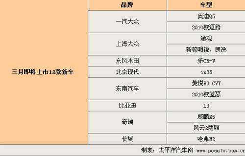 春節(jié)過后,是各車企正式在新的一年里開始上演新車部署好戲的開始。今日,編輯搜集了13款即將在3月先后上市的新車消息,其中有合資品牌重磅車型北京現(xiàn)代ix35、國產(chǎn)Q5和上海大眾途觀等,還有以威麟X5為主的6款自主品牌車型,下面為網(wǎng)友重點介紹其中8款新車: