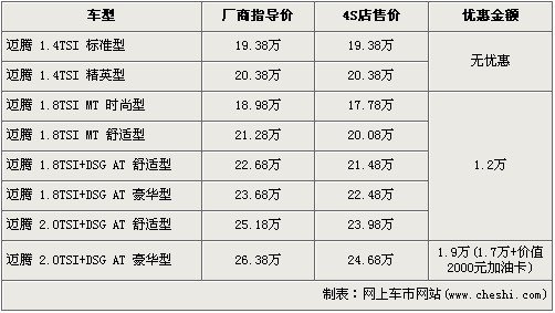 據(jù)北京一汽大眾經(jīng)銷(xiāo)店銷(xiāo)售人員介紹,邁騰全系最高配的2.0TSI自動(dòng)豪華版灰色車(chē)型近期出現(xiàn)了總價(jià)值1.9萬(wàn)元的優(yōu)惠,其中包括了1.7萬(wàn)元的現(xiàn)金優(yōu)惠,并且贈(zèng)送價(jià)值2000元的加油卡。銷(xiāo)售人員還介紹,邁騰新上市的1.4TSI車(chē)型停止了前段時(shí)間的加價(jià),店內(nèi)有現(xiàn)車(chē),1.8TSI車(chē)型優(yōu)惠1.2萬(wàn)元。