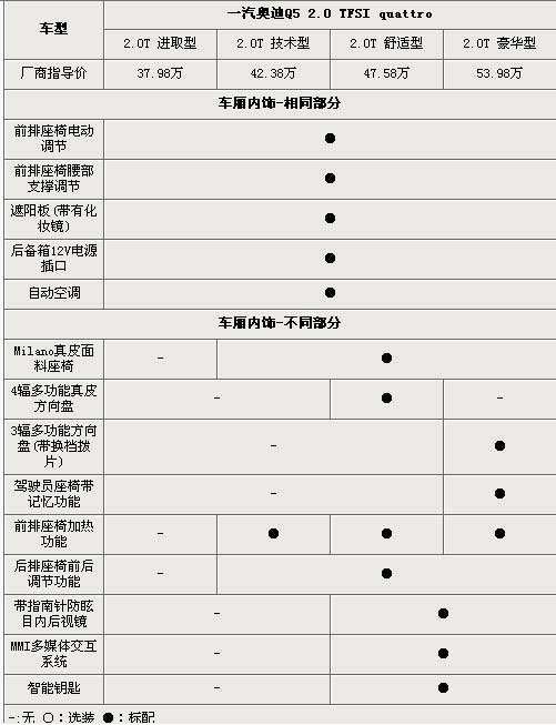 在內(nèi)部配置上,奧迪Q5前排的駕駛員以及副駕駛提供了帶有腰部支撐功能的電動(dòng)可調(diào)節(jié)座椅,除了進(jìn)取型外,其他3款前排座椅均帶有加熱功能,且豪華版車型的前排座椅還配有電動(dòng)記憶功能。入門級(jí)的進(jìn)取型采用的是Havanna織物面料座椅,而其他3款車型均采用了Milano真皮包裹的座椅。進(jìn)取型以及技術(shù)型采用了4輻真皮方向盤,舒適型的4輻方向盤帶有多功能鍵,為了增添駕駛樂趣,豪華版車型在3輻多功能真皮方向盤的后方配有換擋撥片。值得一提的是,技術(shù)型、舒適型以及豪華型的后排座椅可以前后調(diào)節(jié)100mm,為體型稍胖的乘客提供了更大的腿部空間。