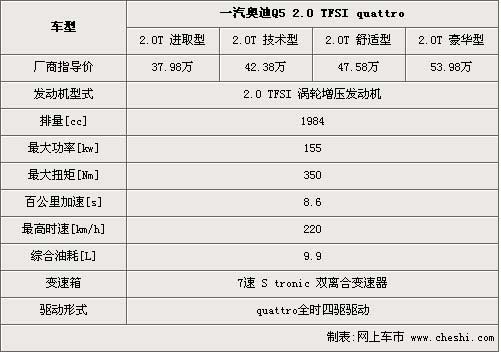 國(guó)產(chǎn)奧迪Q5搭載了大眾EA888系列的2.0TFSI渦輪直噴發(fā)動(dòng)機(jī),經(jīng)過(guò)重新調(diào)校后,此款發(fā)動(dòng)機(jī)的最大功率為155kw,而在1500-4200轉(zhuǎn)可以爆發(fā)出350Nm的最大扭矩。奧迪Q5采用了7速 S tronic 雙離合變速器,此款變速器既充滿手動(dòng)變速箱的駕駛樂(lè)趣,同時(shí)又融合自動(dòng)變速器便捷操作的變速器,換擋的頓挫感更小,平順性也更好,再配上奧迪的quattro全時(shí)四驅(qū)驅(qū)動(dòng)方式,奧迪Q5被打造成了真正的一款注重性能的SUV車(chē)型。