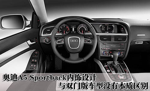 奧迪A5 Sportback四門轎跑車擁有與奧迪A系家族車型一致的內(nèi)飾設(shè)計(jì),最大的區(qū)別在于車廂布局上。銀白色的金屬裝飾條和黑色防反光儀表板,突出時(shí)尚與動(dòng)感的視覺效果,甚至在車頂和座椅的色彩選擇上都采用了冷酷的黑色。