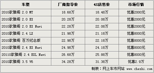 新雅閣一直是日系中級(jí)車型的典型代表,新雅閣憑借其大氣的外觀、舒適的空間和豪華的配置在中級(jí)轎車市場(chǎng)中占據(jù)了一席之地。去年,廣汽本田又對(duì)第8代雅閣進(jìn)行了小改款,對(duì)原來(lái)車型的配置有一定程度提升,部分車型增加了智能鑰匙和后遮陽(yáng)板等,提高了雅閣整體車型的性價(jià)比。近日根據(jù)網(wǎng)上車市價(jià)格監(jiān)測(cè)系統(tǒng)顯示,目前雅閣全系最高優(yōu)惠近3萬(wàn)元,2.4L現(xiàn)車較齊全。具體價(jià)格以及優(yōu)惠幅度如下:
