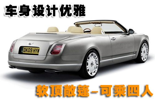這款新車擁有與Mulsanne四門豪華轎車相同的華麗外形,采用軟頂敞篷設(shè)計(jì),兩排座椅可舒服的乘坐四位成年人。內(nèi)飾豪華舒適,用料考究屬于奢侈級(jí)的豪華敞篷轎跑車。