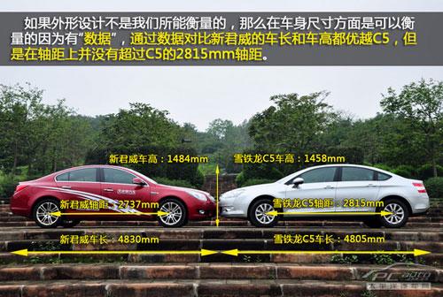 如果不是看到數(shù)據(jù),你絕對不會認(rèn)為新君威比C5還要長,C5的2815mm軸距使得整個車的視覺效果相當(dāng)明顯,以至于當(dāng)我們把兩輛車,車頭對車頭放在一起時,在場的所有人都發(fā)出了一樣的感嘆:C5這車真大!