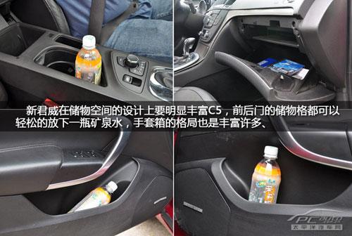 車內儲物空間我們用的是“飲料瓶”來衡量看看究竟那款車更人性,新君威車內的儲物空間設計相當人性化,前后側門的儲物格能放進去飲料瓶,手套箱的儲物格局也是很豐富,排擋前方預留了2個飲料瓶的儲物槽,但是中控臺上方對于票據(jù)、錢包、手機等雜物空間設計就沒有C5那么人性。