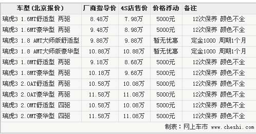 由于瑞虎大師版車型剛剛上市,4S店還沒有現(xiàn)車銷售,消費者如果想預訂此車型需要交納1000元定金,預計提車周期在1個月左右。雖然大師版沒有現(xiàn)車也暫無優(yōu)惠,但是4S店表示現(xiàn)在購買瑞虎3的其他車型,可享受4000元現(xiàn)金優(yōu)惠,還可以贈送一些裝飾,目前車型顏色并不齊全,白色均無現(xiàn)車需要預定。