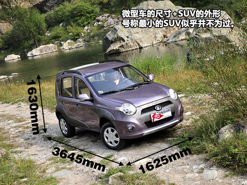 迷你SUV采用了和精靈相同的底盤,確切的說,它是在精靈基礎上對進行了改進,所以在外形上,這兩款車并沒有太大的差別,3645mm×1625mm×1630mm的車身尺寸比精靈3548mmX1580mmX1581mm大了一圈,主要原因在于增加了車身包圍以及底盤的升高,不過這樣的個頭仍然看起來十分嬌小。
