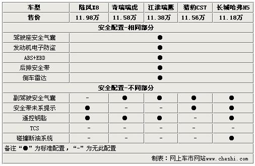 安全方面5款車都做得還算到位,前排雙安全氣囊只有X8沒有全部提供,而發(fā)動(dòng)機(jī)電子防盜、ABS+EBD、后排安全帶、到車?yán)走_(dá)這些日趨普及的安全措施,5款車全部配備。剛剛上市的哈弗H5還配備了一項(xiàng)區(qū)別于其他車型新功能-碰撞斷油系統(tǒng),通過名字我們就可以知道它的主要作用是什么。