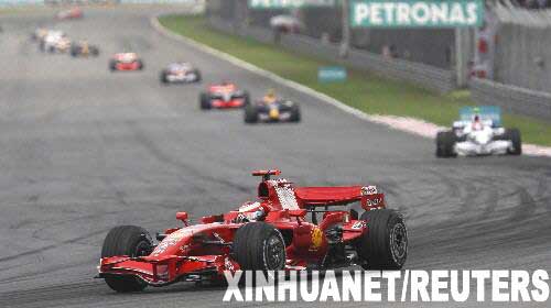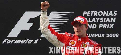 3月23日,法拉利車隊車手萊科寧(前)駕駛賽車角逐。當日,在F1大獎賽馬來西亞站的比賽中,萊科寧以1小時31分18秒555的成績奪得冠軍。