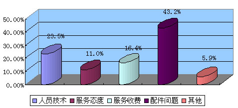 報(bào)告顯示,在汽車產(chǎn)品服務(wù)質(zhì)量的投訴中,對(duì)配件問題、服務(wù)態(tài)度的投訴較上一季度有所增加,對(duì)人員技術(shù)、服務(wù)收費(fèi)的投訴有所下降。其中,久修不好是引發(fā)消費(fèi)者投訴廠家服務(wù)質(zhì)量的最主要原因。具體構(gòu)成比例:人員技術(shù)占23.5%,服務(wù)態(tài)度占11.0%,服務(wù)收費(fèi)占16.4%,配件問題占43.2%,其他占5.9%。