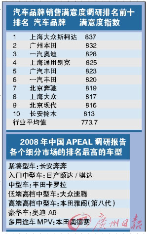 無獨有偶,由國務院國資委研究中心、中國汽車工業(yè)協(xié)會、中國質(zhì)量協(xié)會、中國環(huán)保協(xié)會等權(quán)威機構(gòu)創(chuàng)立的獨立第三方調(diào)研活動——“2008中國汽車品牌銷售滿意度調(diào)查”結(jié)果出爐,2008年汽車銷售行業(yè)滿意度指數(shù)平均分值773.7,較上年提升了5分。但與2007年相比,本土品牌的銷售滿意度大幅下降5.7%。