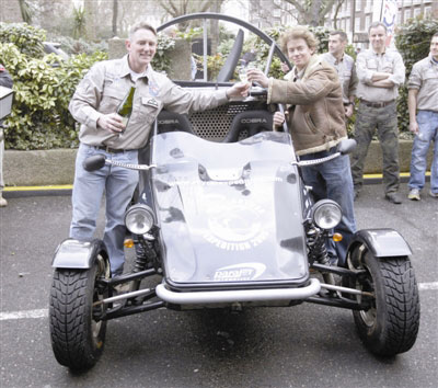風(fēng)扇汽車既可以在崎嶇不平的沙地飛馳,又能像飛機(jī)一樣在空中飛行。在降落傘和一個(gè)巨型風(fēng)扇發(fā)動(dòng)機(jī)的幫助下,探險(xiǎn)家們計(jì)劃先在安道爾附近的比利牛斯山脈上空飛行,穿越14公里長的直布羅陀海峽,接下來,將飛越摩洛哥阿特拉斯山脈和撒哈拉沙漠,哪里沒有了公路,他就從哪里發(fā)動(dòng)風(fēng)扇發(fā)動(dòng)機(jī)駕車升空。