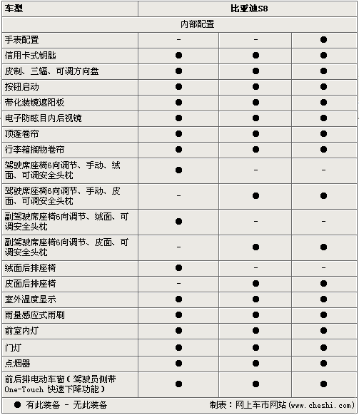 在空調(diào)、音像設(shè)備方面,S8配置了自動(dòng)空調(diào)系統(tǒng)、DVD娛樂系統(tǒng)及USB接口等,同時(shí)高配的豪華型擁有藍(lán)牙通信系統(tǒng)、GPS導(dǎo)航及負(fù)離子發(fā)生器等高端配置。 說了這么多,消費(fèi)者更關(guān)心的應(yīng)該是這款硬頂敞篷跑車的價(jià)格了,據(jù)內(nèi)部人士透露它的價(jià)格將在20萬元以內(nèi)。這樣的價(jià)格對于一款自主品牌的車似乎貴了一些,比亞迪是否會(huì)給我們帶來驚喜呢?讓我們拭目以待!