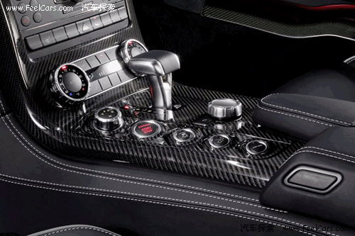 看到內(nèi)飾的第一感覺就是運動感很強(qiáng),無論是全黑色的真皮內(nèi)飾,還有鑲嵌點綴在各處的碳纖維面板,或者是三輻、平底的真皮方向盤,像瞄準(zhǔn)鏡一般的空調(diào)出風(fēng)口等等,都毫不客氣的顯露出了SLS以運動為本的設(shè)計理念,當(dāng)然,這也是在向前輩300SL致敬。