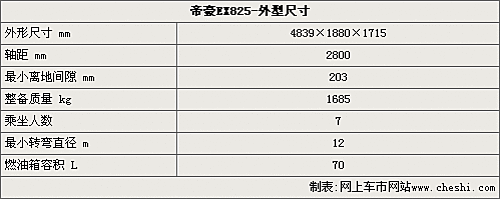 從帝豪EX825的車型尺寸來看,這款大型SUV的車長達(dá)到了4839毫米、寬度為1880毫米、高度為1715毫米。而且這款車的軸距也達(dá)到了2800毫米,采用7座的設(shè)計,從這些數(shù)據(jù)來看,這款新車不僅是以豪華為主要設(shè)計方向,也注重了整車的實用性。