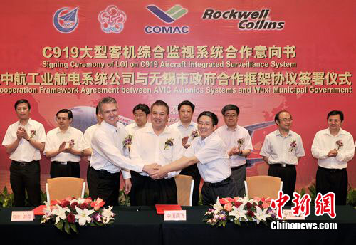 中新網(wǎng)無錫7月8日電(記者 孫權(quán))中國商用飛機有限責(zé)任公司、中航工業(yè)雷達(dá)與電子設(shè)備研究院和美國羅克韋爾柯林斯公司三方今日在無錫“握手”,確定國產(chǎn)C919大型客機綜合監(jiān)視系統(tǒng)的研制生產(chǎn)項目落戶無錫市濱湖區(qū)。幾年后,裝備“無錫造”綜合監(jiān)視系統(tǒng)的C919大型客機,將翱翔在中國的藍(lán)天,并飛行在世界各地。