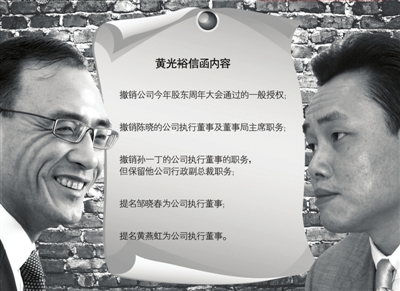 8月5日,國(guó)美電器公告,將對(duì)公司間接持股股東及前任執(zhí)行董事黃光裕提出法律訴訟,包括關(guān)于其于2008年1月及2月前后回購(gòu)公司股份中被指稱的違反公司董事的信托責(zé)任及信任的行為尋求賠償。公告同時(shí)披露,黃光裕要求撤銷陳曉的公司執(zhí)行董事和董事局主席職務(wù)、撤銷孫一丁的公司執(zhí)行董事的職務(wù),但保留他為公司行政副總裁職務(wù)等動(dòng)議。這份火藥味十足的公告,被稱為是黃光裕與國(guó)美電器現(xiàn)任董事局主席陳曉決裂的標(biāo)志。