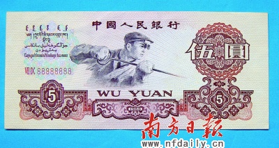 被收藏界稱為“豹號”的8個“8”連號人民幣現(xiàn)身云浮。日前,來自該市羅定的民間收藏家王河先生向記者展示其收藏的8個“8”連號的人民幣,該幣為1960年版的第三套人民幣5元紙幣,已退出流通領(lǐng)域。據(jù)了解,該5元幣曾獲世界紙幣設(shè)計金獎。8個“8”的吉祥號碼被收藏界稱之為“豹號”,向來難得一見,目前已有來自茂名的收藏愛好者開價88888元求購。(記者/楊紅雨特約通訊員/廖榮波)
