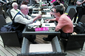 昨晚5時(shí),民族園快捷假日酒店一層大廳,兩組長(zhǎng)條餐桌擺放在現(xiàn)場(chǎng)的正中央!鞍头铺亍焙汀吧w茨”的名牌赫然擺放在兩排桌子的頭位,但位子一直空著。此前平民晚宴通過(guò)媒體向兩人發(fā)出邀請(qǐng)。其余座位都已坐滿(mǎn),不斷有人簽到,只得在長(zhǎng)桌的一側(cè)加座位。近100人參加平民晚宴,涉及公司白領(lǐng)、企業(yè)老板、大學(xué)生、公務(wù)員、醫(yī)生等各行業(yè)。