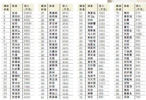 本次榜單前三名均來(lái)自港臺(tái)地區(qū),56歲的功夫巨星成龍登上榜首,去年5月他成為在“鳥(niǎo)巢”舉辦個(gè)唱的第一人,150多名明星嘉賓輪番登臺(tái),觀眾超過(guò)7.5萬(wàn)人。周杰倫位居第二,沒(méi)有新唱片并不影響商家和粉絲的追捧,他努力嘗試新的影視作品,有得有失。排在第三位的劉德華出演了3部電影,由于婚事曝光備受關(guān)注。今年雖共有43位明星來(lái)自港臺(tái),但其成就卻都仰仗于大陸市場(chǎng)。在他們眼中,兩岸三地之間的界限越來(lái)越模糊。小巨人姚明仍穩(wěn)居大陸第一名。章子怡緊隨其后,雖然飽受爭(zhēng)議仍獲得25個(gè)封面報(bào)道。