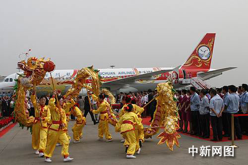 中新網(wǎng)成都6月23日電(楊杰 陳典路)23日下午17點(diǎn)09分,國內(nèi)總裝的第一架空客A320飛機(jī)、“中華龍”號(hào)調(diào)機(jī)航班抵達(dá)成都雙流機(jī)場(chǎng),飛機(jī)緩緩滑向停機(jī)位,兩輛噴水車為飛機(jī)“噴水洗塵”;機(jī)坪上鑼鼓聲聲,獅舞龍騰。至此,國內(nèi)總裝的第一架空客A320飛機(jī)正式落戶四川航空。