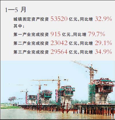 國(guó)家統(tǒng)計(jì)局今天發(fā)布的信息表明,今年前5月,城鎮(zhèn)固定資產(chǎn)投資53520億元,同比增長(zhǎng)32.9%。其中,中央項(xiàng)目投資4734億元,同比增長(zhǎng)28.0%;地方項(xiàng)目投資48786億元,增長(zhǎng)33.4%。從產(chǎn)業(yè)看,第一、二、三產(chǎn)業(yè)分別完成投資915億元、23042億元和29564億元,同比分別增長(zhǎng)79.7%、29.1%和34.9%。