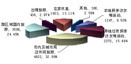 調(diào)查結果顯示,57.33%的受訪者計劃在國內(nèi)旅游,其中:32.88%受訪者有意在市內(nèi)及城市周邊休閑旅游,24.45%的受訪者有意跨區(qū)域國內(nèi)旅游;2.97%的受訪者計劃出境旅游;23.99%的受訪者有意探親訪友,其中:15.49%的受訪者計劃異地過夜探親訪友;13.11%的受訪者計劃在家休息。