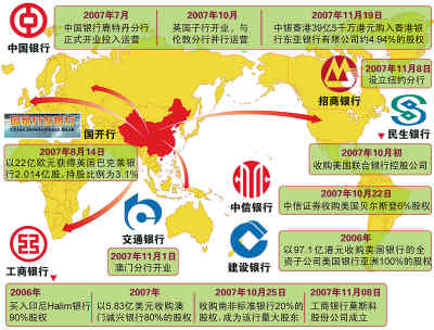繼建行、中行和工行之后,交通銀行、民生銀行分別表示將在今年邁出海外并購的步伐。加上去年10月,我國金融企業(yè)進(jìn)行的最大一筆海外收購——工行以55億美元的價格收購南非標(biāo)準(zhǔn)銀行20%股份,我國國有銀行進(jìn)軍國際市場已開足馬力。