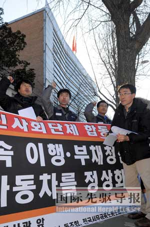 1月13日上午,中國駐韓大使館門前的寧靜被打破:30多名韓國雙龍汽車工會成員高舉橫幅標語,向早已等候在現(xiàn)場的媒體記者宣讀了一份聲明,要求中韓兩國政府采取救助措施,查處所謂的上汽“技術(shù)轉(zhuǎn)移”問題?棺h活動進行了一個多小時。