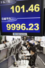 電子牌顯示日經(jīng)指數(shù)跌破1萬點(diǎn)關(guān)口,美元兌日元比價(jià)升至101上方。7日上午9點(diǎn)18分?jǐn)z于東京東新橋的外匯.COM。(共同社)