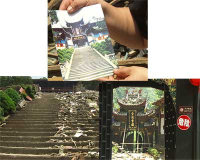 青蓮鎮(zhèn)的李白故居與李白紀(jì)念館緊緊相連,在一個(gè)類似北京四合院的地方,記者看到,除個(gè)別的房梁被拉扯變形、位移外,主體建筑基本上完好,但是距離李白故居只有30米遠(yuǎn)的山門,已經(jīng)成了一片廢墟。