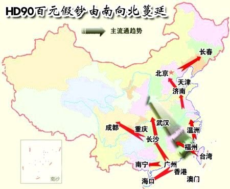 1月8日,央行就此事在北京召開記者招待會,央行貨幣金銀局局長葉英男澄清了HD90版假幣“高仿真”的傳言。部分城市的警方已經(jīng)就假幣事件立案調(diào)查。然而,透過沸沸揚(yáng)揚(yáng)的假幣風(fēng)波,人們不禁要問,如此大規(guī)模的假幣事件頻發(fā),背后是怎樣一只無形的黑手?一條由南向北、自東向西的假幣蔓延路徑,漸漸浮出了水面……