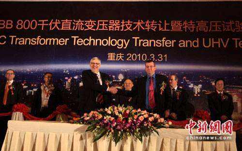 中新網(wǎng)重慶3月31日電(記者 郭虹)31日,位居全球500強(qiáng)之列的電力和自動(dòng)化技術(shù)領(lǐng)域的廠商ABB集團(tuán)在渝簽署協(xié)議,將800千伏高壓直流變壓器技術(shù)轉(zhuǎn)讓給其在華企業(yè)——重慶ABB變壓器有限公司;同時(shí),ABB特高壓試驗(yàn)中心亦在此落成。