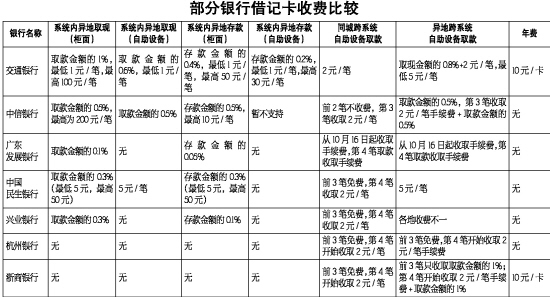 根據(jù)目前杭州各家銀行公布的收費標(biāo)準(zhǔn)看,四大銀行的銀行卡收費標(biāo)準(zhǔn)是最高的。記者咨詢了多家銀行的收費標(biāo)準(zhǔn),市民在選辦銀行卡時,不妨做個比較。(黃丹)