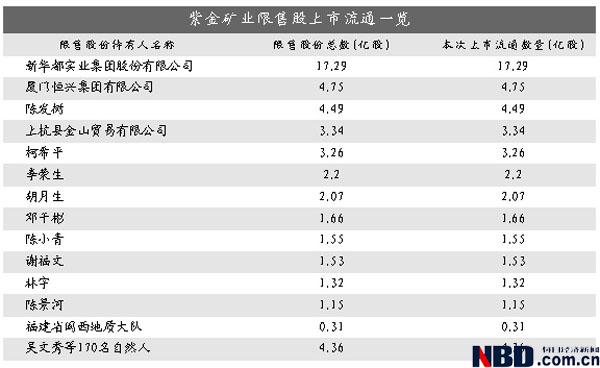 此外,廈門恒興實業(yè)有限公司和上杭縣金山貿易有限公司分別持有4.75億股和3.34億股。陳發(fā)樹、柯希平、李榮生、胡月生、鄧干彬、陳小青、謝福文、林宇以及陳景河9位自然人解禁股數(shù)也超過了1億股,其中陳發(fā)樹解禁數(shù)量最多,達到4.49億股。這些自然人股東的賬面收益最多的高達44億元,最少的也有11.27億元。