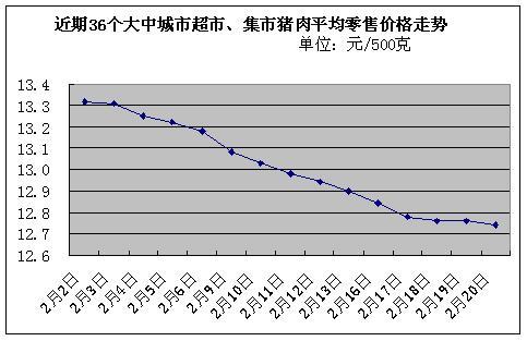 中新網(wǎng)2月23日電 據(jù)國家發(fā)展改革委價格監(jiān)測中心監(jiān)測,上周(2009年2月16日~2009年2月20日,下同)全國36個大中城市集市、超市豬肉(精瘦肉)平均零售價格每500克為12.78元,與前一周(2009年2月9日~2009年2月13日,下同)相比下降1.62%。