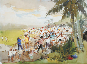 我鉆進(jìn)椰子林作畫,其熱無(wú)比,連油色的錫管都燙手。忘了在何處,林中小蟲(chóng)特多,咬得緊,穿著長(zhǎng)褲、長(zhǎng)袖襯衣,且將袖口和衣領(lǐng)都包得嚴(yán)嚴(yán)實(shí)實(shí),但回到宿店才知滿身都是紅塊塊,奇癢難忍,店主頗可憐我,說(shuō):氓!氓!我聽(tīng)不懂廣東話,她用筆寫,原來(lái)是蚊。