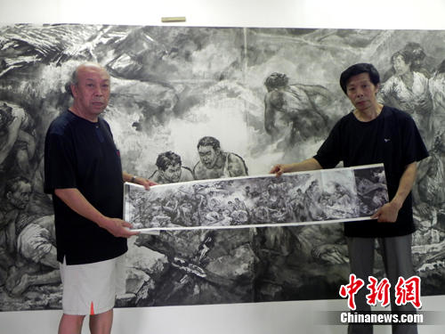 記者在唐山市一社區(qū)里,見到了四位作者中的喬文科與孫淑文。據(jù)二位畫家介紹,《唐山大地震祭》巨幅水墨畫長(zhǎng)卷裝裱完后高2.35米,長(zhǎng)度近百米,歷經(jīng)四年艱苦努力,終于完成。