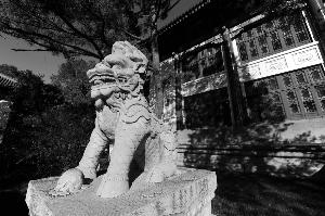 在文津街國(guó)家圖書(shū)館門前,一對(duì)威武的石獅滿面滄桑,雙爪和臀部還有修補(bǔ)的痕跡!皼](méi)錯(cuò),這對(duì)劫后余生的石獅就是來(lái)自圓明園。”傳達(dá)室的守門人對(duì)石獅的來(lái)歷略知一二。石獅長(zhǎng)170厘米,高約300厘米。上世紀(jì)30年代由圓明園移至此處。