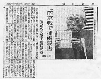 12月8日出版的日本《每日新聞》,以《“攻打南京的時(shí)候曾經(jīng)殺害過俘虜”——一名日軍士兵從軍日記中的記述》為題,刊登了記者結(jié)城薫的一篇消息,并附上了說明為“牧野久仁博正在介紹父親的從軍手記”的照片。