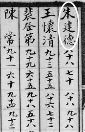 在 《四川省城高等學(xué)堂體育學(xué)堂甲乙兩班學(xué)生積分表》上,記者找到了朱德的學(xué)習(xí)成績(jī)記錄,不過成績(jī)單上使用的名字是朱建德。這份成績(jī)單共列出了朱德修身、國(guó)文、教育、心理、生理、兵學(xué)、器械等13門學(xué)科的成績(jī),其中器械課的成績(jī)最好,達(dá)到滿分一百,心理課成績(jī)也有98分。全班52人中,朱德的總成績(jī)位居第10名。
